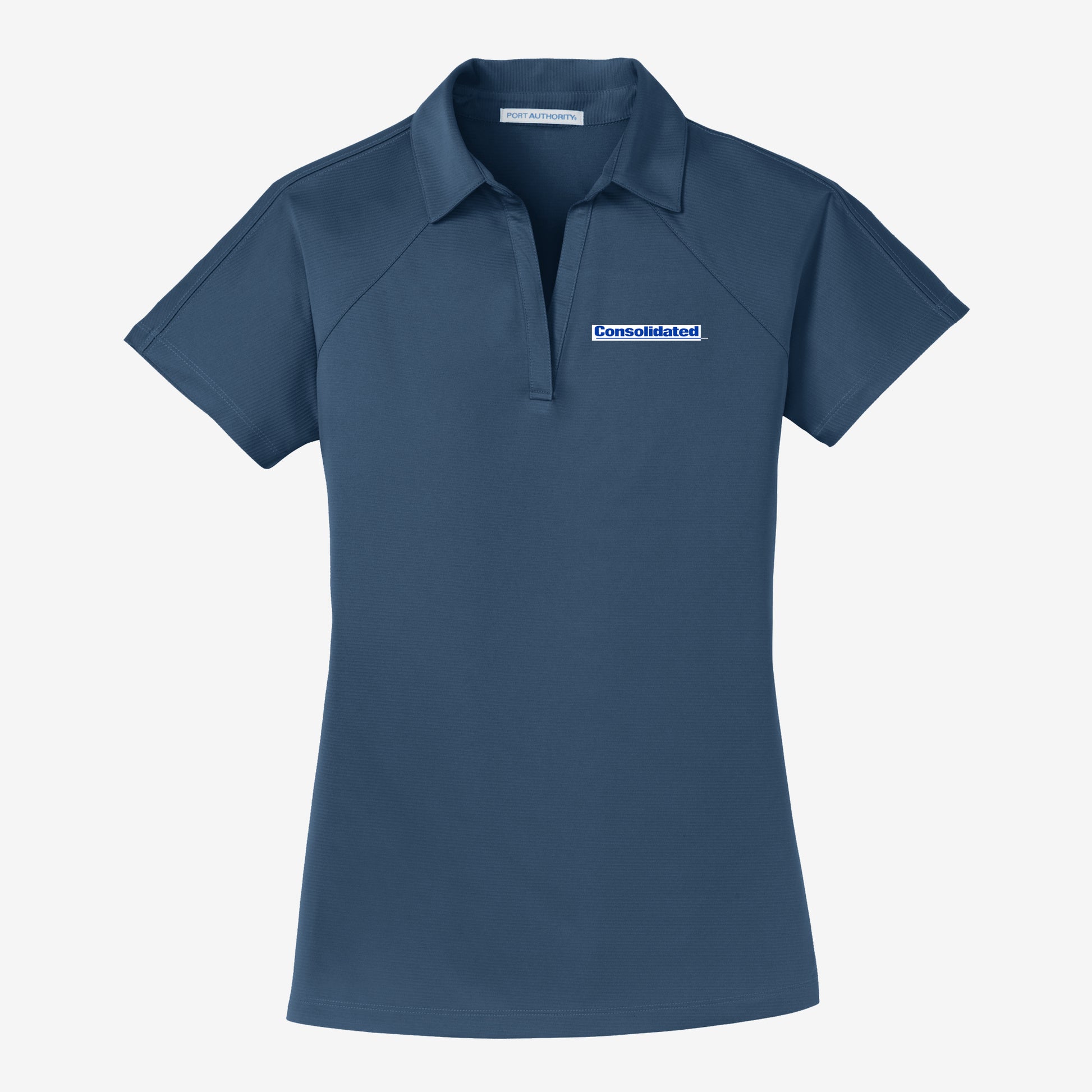 Port Authority Ladies Crossover Raglan Polo. 5-ounce, 100% polyester. Self-fabric modified Johnny collar. Wrap around back panel detail. Open hem sleeves.